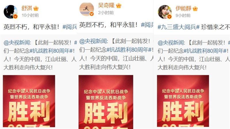 具体到艺人发声,舒淇写下“英烈不朽,和平永駐!”,吴奇隆则表达同样的和平立场;张庭、伊能静、林瑞陽亦发出各自的致辞,黄安则清晨就宣布一家人一起在线观看九三阅兵。陆委会副主委沈有忠表示,政府在三天前已公布调查结果,警示艺人别被政治议题左右,若九三阅兵后持续有矮化中国主权或配合统战的言论,将逐一裁处。