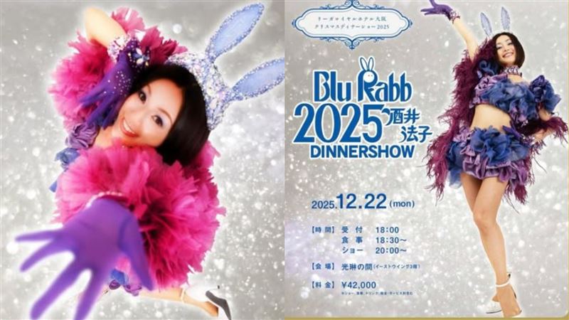 酒井法子宣布12月在金澤日航酒店與大阪麗嘉皇家酒店分別舉辦兩場晚餐秀,官方海報上她戴著兔耳、穿著短版上衣與迷你裙,氣場十足,粉絲紛紛表示彷彿回到全盛時期。
