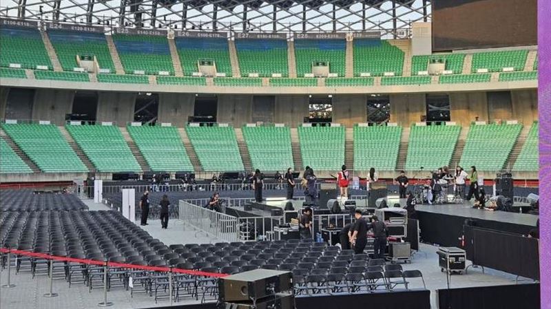QWER率先抵台參與AAA十週年盛典,首次移師台灣在高雄世運主場館舉辦,今天迎來第一波藝人陸續抵台並現身彩排。現場畫面透露彩排井然有序,QWER成員走上舞台中央示範節目流程,瞬間引發粉絲熱潮。