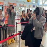 潤娥則以全黑穿搭現身,黑色外套搭配黑絲襪,氣質依舊。她雖戴著口罩,但仍掩不住明星氣場。面對粉絲遞出的應援禮物,她特地停下腳步收下,向對方點頭致意,展現貼心一面。由於人潮過於踴躍,現場保全不斷維持動線,而潤娥一路保持冷靜,快速通過報到與安檢區。